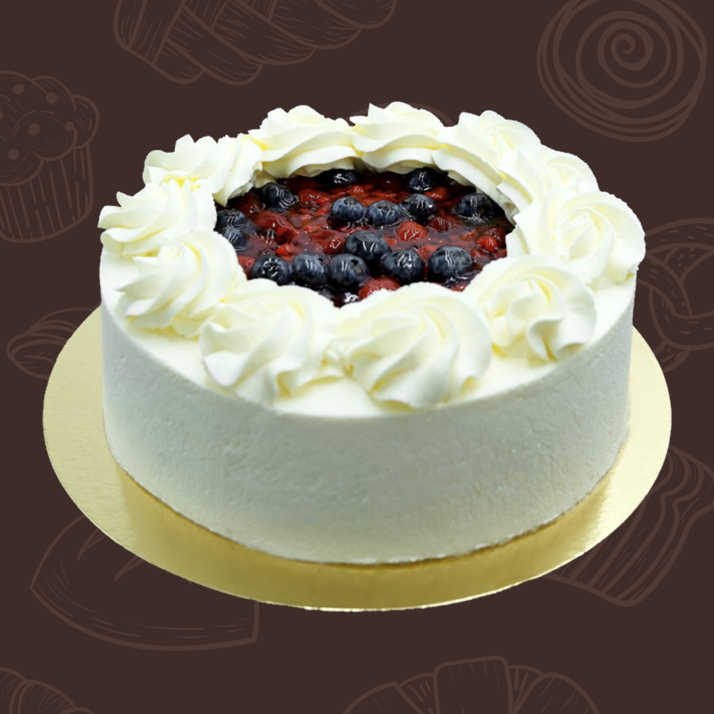Gluteention kuningatarkermakakku, jonka kerrosten välissä vadelma- sekä mustikkahilloa. Kakun päällä kotimaisia vadelmia sekä pensasmustikoita.