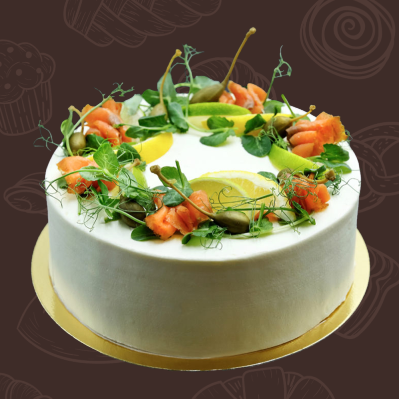 Perinteinen lohivoileipäkakku. Käytämme kotimaista kirjolohta kakuissa.